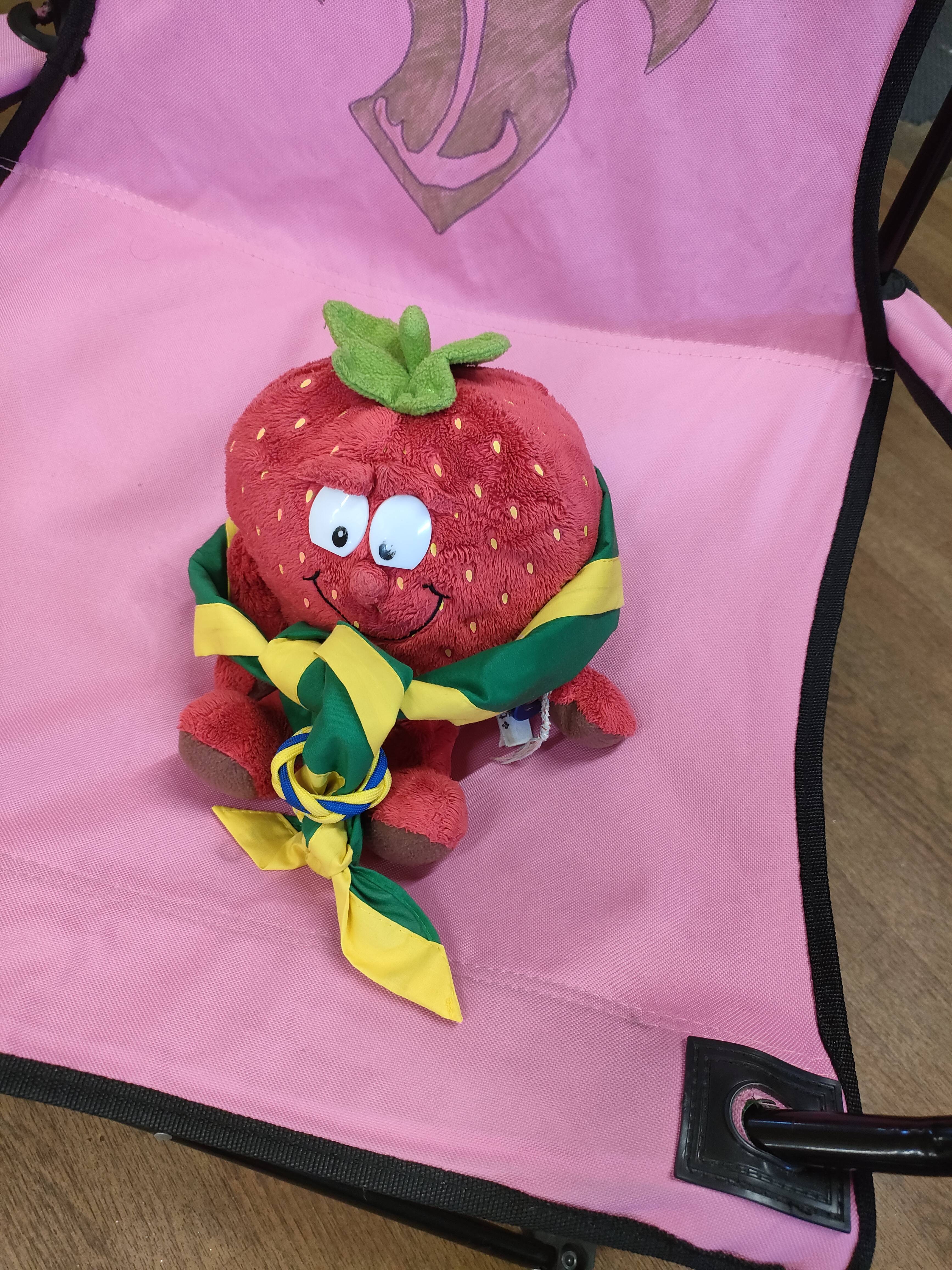 Olave (Left) is our unstealable mascot with a very cute duck Woggle Twiggle (Right) is our stealble mascot with a lovely starfish Woggle and camp blanket, displaying all 8 of our drinkers badges. |